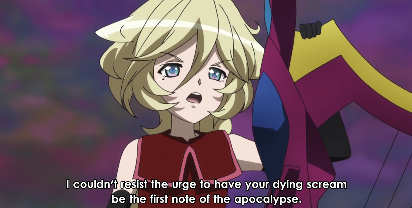 | Scores | 9/10 🌟GLORIOUSNESS: A dramatic sacrifice, a dramatic showdown, a dramatic rescue, a dramatic transformation. It's all just so good! 9/10 🎶 MUSIC: Carol's song again, an excellent Hibiki song for their Ignited attempt to stop Carol, but the highlight for me was the Maria-Shirabe-Kirika song. It was excellent! 9/10 🎬 NARRATIVE CHAOS: Did we really need the Carol-monologue about the power of song? Or rather, did we really need it right then?! Right after the Châtteau was destroyed? Good stuff all around though, very much including "killing off" the B team and immediately bringing them back in the same episode. 10/10 🧼 SLEAZINESS: Just a clean episode! 9.3/10 🧮 TOTAL SCORE: This. This is Symphogear firing on all cylinders. It's fast, it's dramatic, it's silly, it doesn't know what the word cringe means. Bring on that finale! |